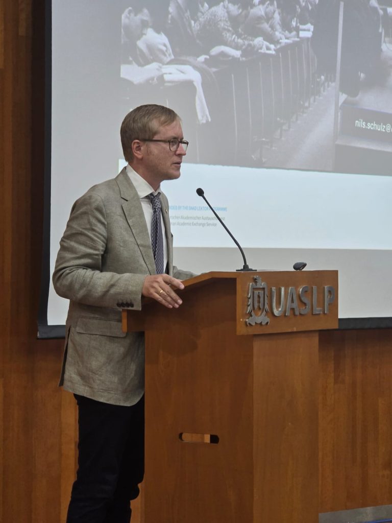 Directores, funcionarios y coordinadores de diversas áreas de las Facultades de la UASLP, así como estudiantes de licenciatura y posgrado, asistieron a la primera charla impartida por el Mtro. Nils Schulz, Lector del Servicio Alemán de Intercambio Académico (DAAD), quien abordó la historia de personajes extranjeros que llegaron a México y dejaron una huella significativa en el país.