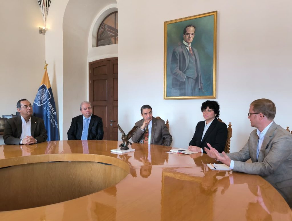 Nils Schulz, originario de Hamburgo, fue recibido el pasado 25 de septiembre por el rector de la UASLP, doctor Alejandro Javier Zermeño Guerra, en una reunión que tuvo lugar en el Edificio Central y en la que también estuvieron presentes la doctora Durdana Prado Álvarez, subdirectora adjunta del DAAD; el secretario general maestro Federico Garza Herrera; el director de la Facultad de Ingeniería doctor Emilio Jorge González Galván y las ex becarias del DAAD doctoras Rosalba Badillo y Sonia Alejandra Torres, quien también se desempeña como embajadora de la organización, entre otros asistentes.