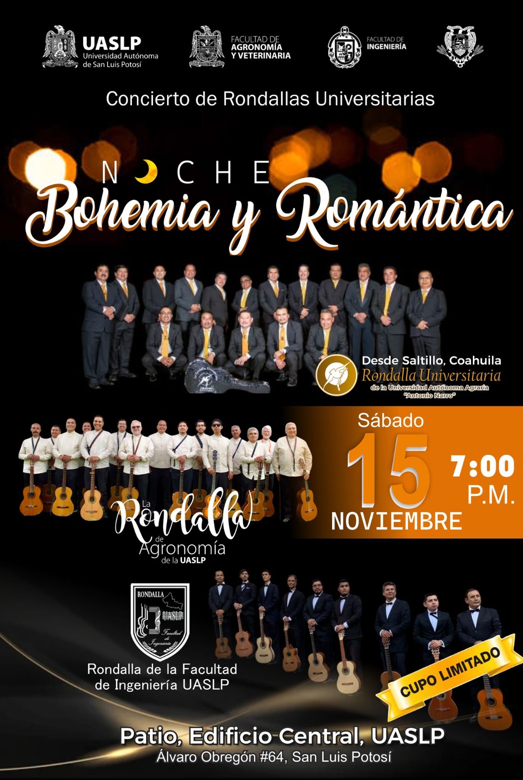 El próximo sábado 15 de noviembre de 2025, a partir de las 19:00 horas, estos tres grupos universitarios ofrecerán una Noche Bohemia y Romántica, un concierto dedicado al público potosino. Será un evento especial donde las agrupaciones unirán sus voces y guitarras para compartir el gusto por la balada romántica en un entorno inigualable.
