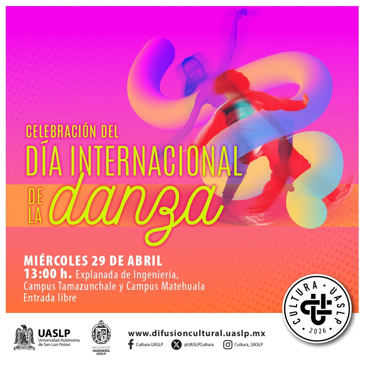 La Universidad Autónoma de San Luis Potosí (UASLP), a través de la Secretaría de Difusión Cultural, conmemorará este miércoles 29 de abril el Día Internacional de la Danza con una jornada de actividades que destacarán el movimiento, la creatividad y la expresión artística. La celebración se llevará a cabo de manera simultánea en los campus de la capital potosina, Matehuala y Tamazunchale, informó el licenciado Juan Carlos Díaz Medrano, coordinador del Departamento de Arte y Cultura.