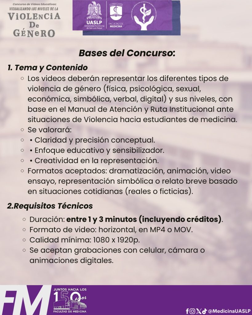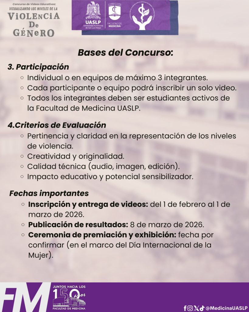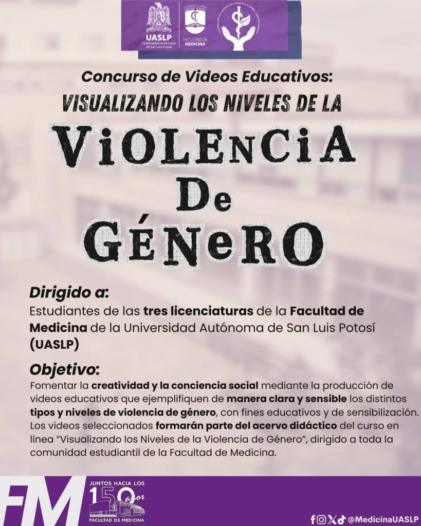La Facultad de Medicina de la Universidad Autónoma de San Luis Potosí (UASLP) lanzó el concurso de video educativo “Visualizando los niveles de la violencia de género”, una iniciativa dirigida a su comunidad estudiantil que busca fortalecer la prevención, la información y la conciencia sobre este problema dentro y fuera de los espacios universitarios.