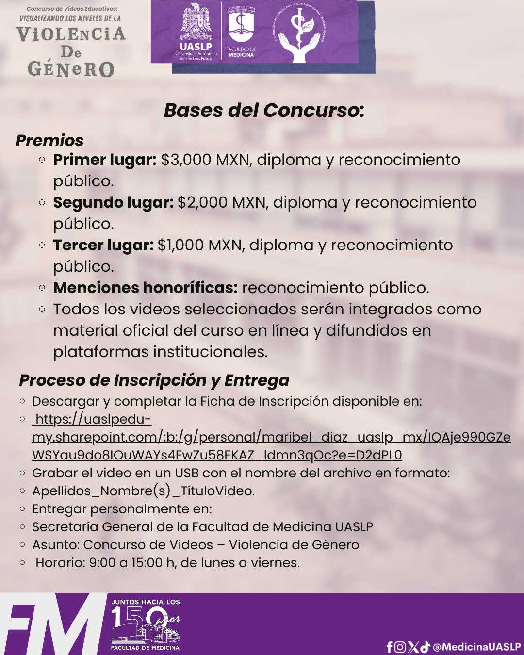 El concurso está dirigido exclusivamente a estudiantes de las tres licenciaturas de la Facultad de Medicina: Médico Cirujano, Fisioterapia y Ciencias Ambientales y Salud. La recepción de los videos será del primero de febrero al primero de marzo en la Secretaría General de la facultad. Las propuestas deberán tener una duración máxima de tres minutos y abordar, de manera clara, los tipos de violencia —psicológica, sexual, económica, entre otras— y su relación con los distintos niveles de gravedad.