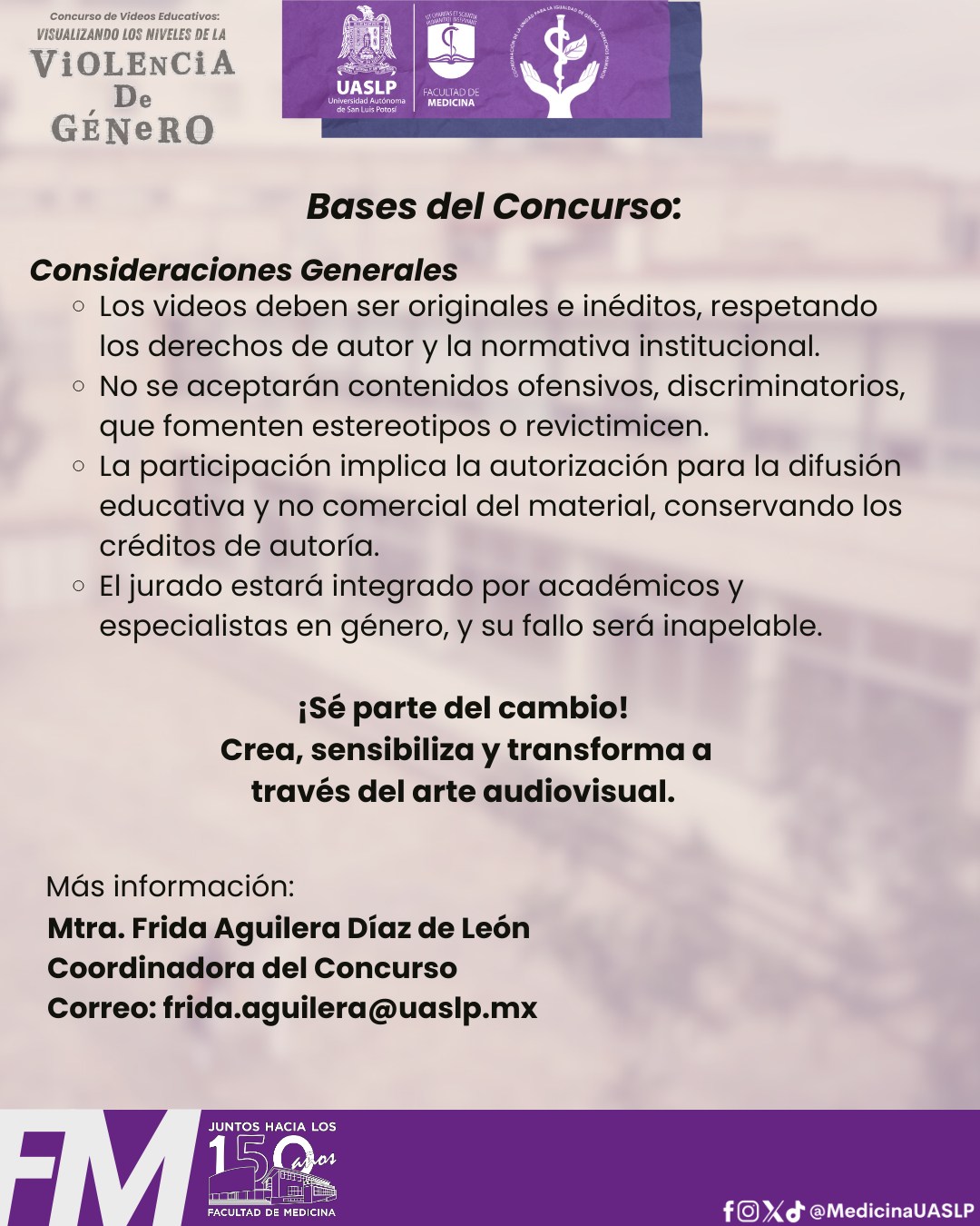 La Facultad de Medicina de la Universidad Autónoma de San Luis Potosí (UASLP) lanzó el concurso de video educativo “Visualizando los niveles de la violencia de género”, una iniciativa dirigida a su comunidad estudiantil que busca fortalecer la prevención, la información y la conciencia sobre este problema dentro y fuera de los espacios universitarios.