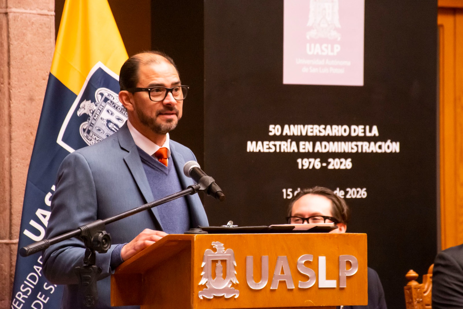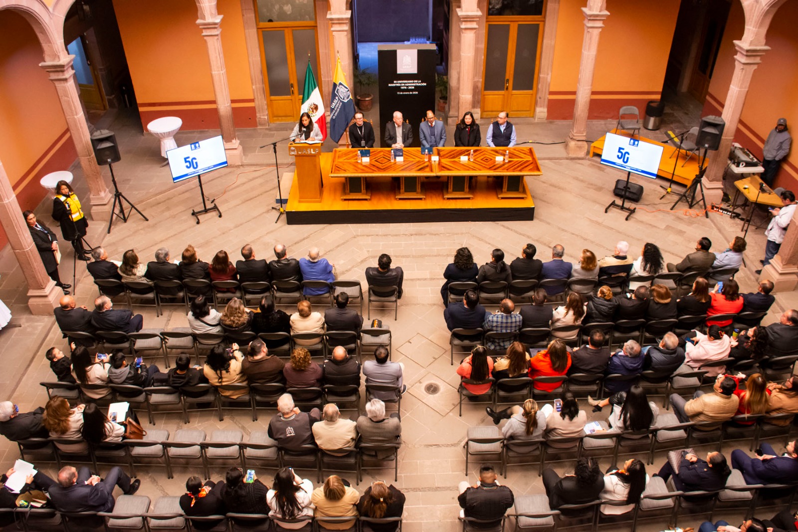 La ceremonia por el 50 aniversario de la Maestría en Administración de la FCA-UASLP se realizó en el Centro Cultural Universitario Caja Real este jueves 15 de enero, fecha en que fue votada la aprobación del posgrado por el Consejo Directivo Universitario en 1976, donde se llevó a cabo un acto protocolario con la participación de autoridades universitarias, docentes, estudiantes y egresados.